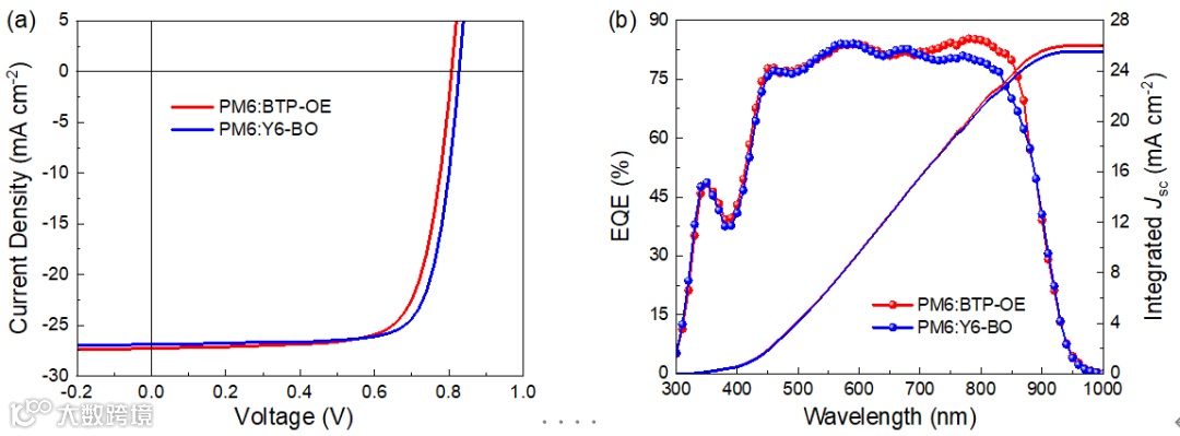 图2. 基于不同受体材料的最优器件的(a)J-V曲线和(b)EQE曲线