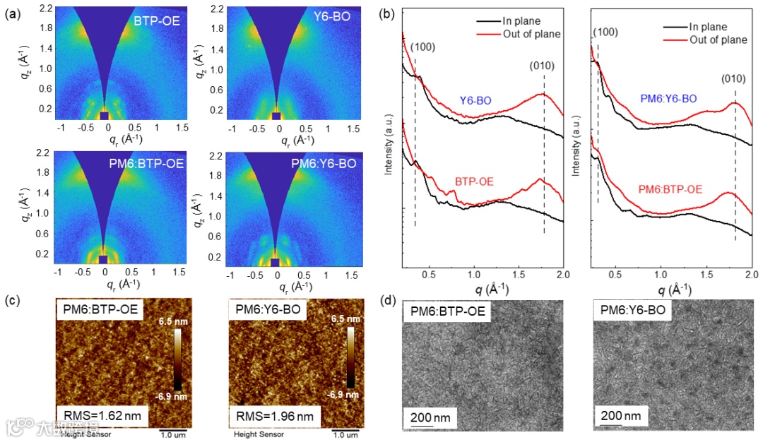 图3. 受体分子BTP-OE、Y6-BO单组分薄膜和共混薄膜的(a)2D GIWAXS衍射图以及(b)面外和面内方向的1D曲线图; 共混薄膜的(c)AFM和(d)TEM图像。