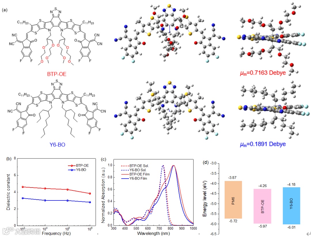 图1.(a)BTP-OE和Y6-BO受体分子的化学结构以及DFT计算得到的几何构型和偶极矩;(b)不同频率下BTP-OE和Y6-BO的相对介电常数;(c)受体分子BTP-OE、Y6-BO在溶液和薄膜状态下的吸收光谱;(d)能级结构示意图。