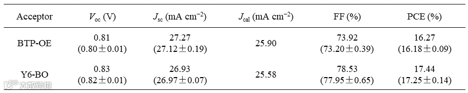 表1. 基于BTP-OE和Y6-BO的最优器件的性能参数统计表
