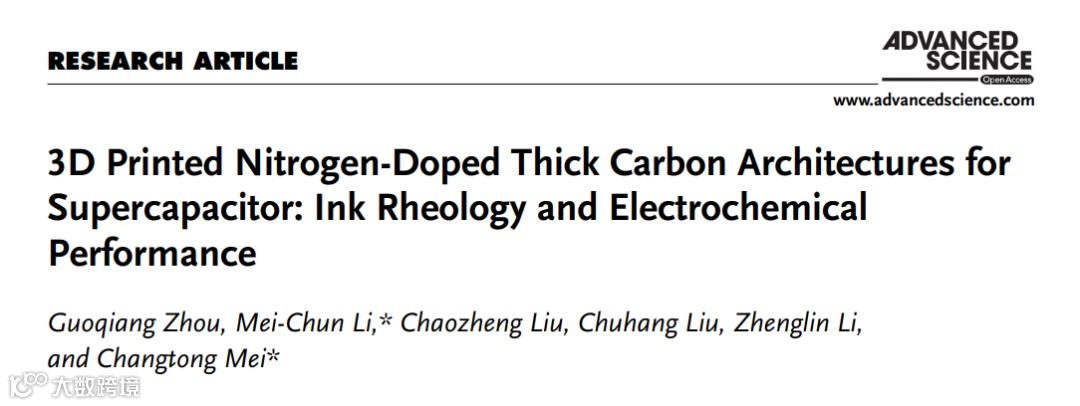 基于此,来自南京林业大学的梅长彤教授和中国石油大学(华东)/南京林业大学的李美春教授,在国际知名期刊Advanced Science上发表题为“3D Printed Nitrogen-Doped Thick Carbon Architectures for Supercapacitor: Ink Rheology and Electrochemical Performance”的文章。