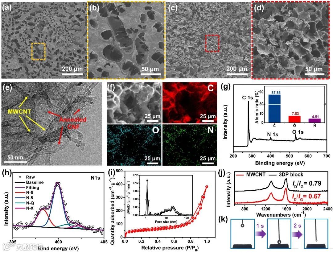 图3. 基于3D打印CNF/MWCNT/Urea凝胶衍生的氮掺杂碳架构的表征