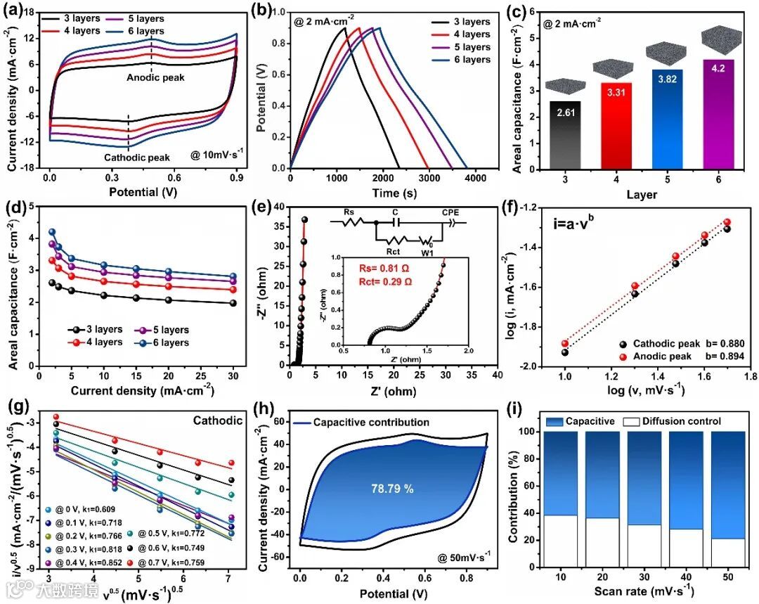 通过设计3D打印时的沉积层数,实现了碳架构在相同面积内的活性物质负载量的调控。在三电极体系下,对不同层数的3D打印碳架构的电化学性能进行了测试。测试结果表明,合理的提高沉积层数,可以有效的提高碳架构的面积比容量。此外,得益于分级多孔结构,以及氮掺杂带来的高导电性和润湿性,3D打印碳架构表现出优异的倍率特性。电化学动力学分析也揭示了碳架构具有良好的电容行为和电荷存储能力。