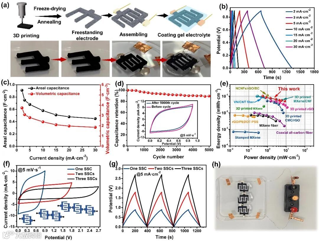 图5. 基于3D打印氮掺杂碳架构的对称型超级电容器的电化学性能