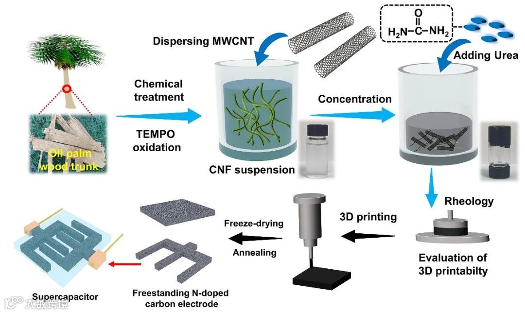 图1. CNF/MWCNT/Urea凝胶墨水的配制及其3D打印氮掺杂碳架构用于构建超级电容器