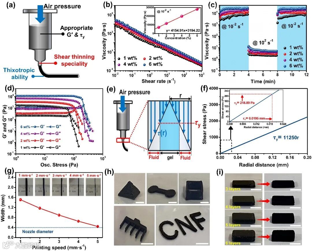 图2. CNF/MWCNT/Urea凝胶墨水的流变特性及可打印性优化