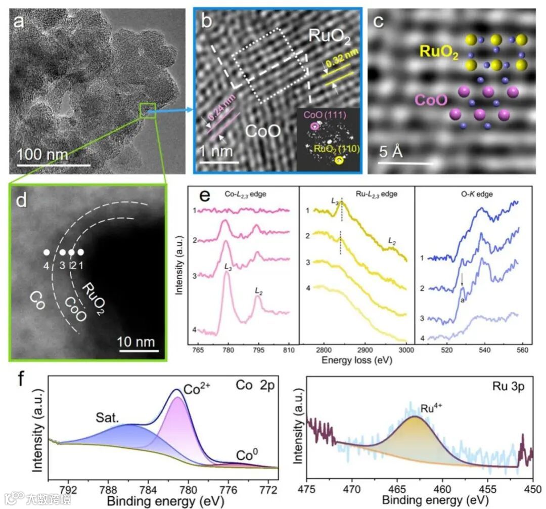 图4. np-Co@CoO/RuO2复合材料界面(a-d)TEM;(e)EELS;(f)XPS