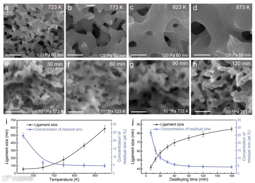 图2. 不同脱合金温度、时间下的纳米多孔钴 (a-h)SEM图;(i-j)韧带尺寸与残留锌浓度