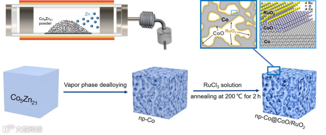 图1. 气相脱合金系统及纳米多孔Co@CoO/RuO2复合材料制备的示意图。内部纳米孔的放大图显示了复合材料界面的原子构型。