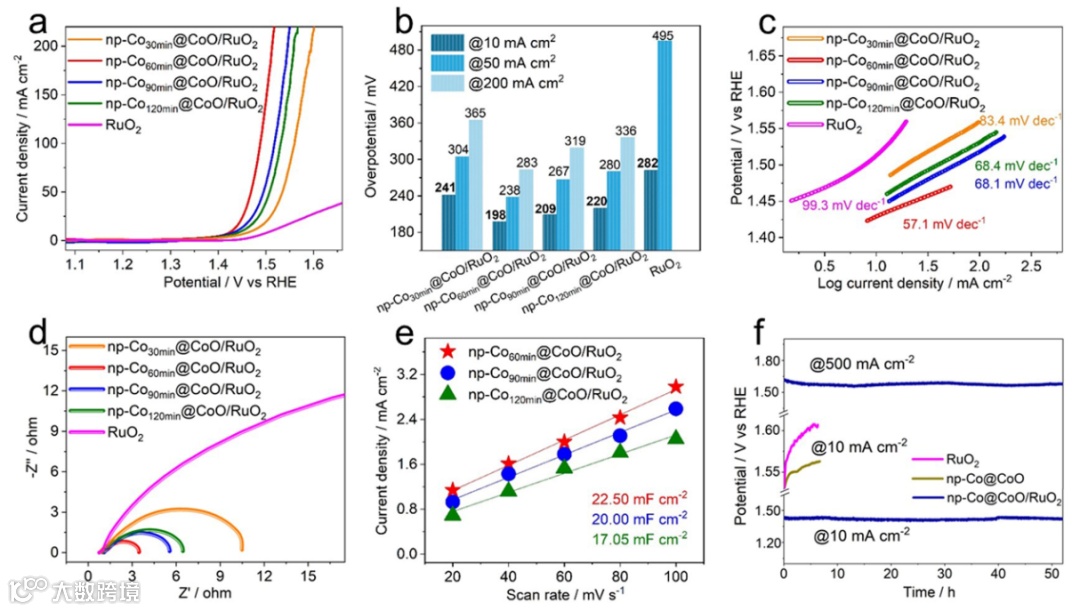 与商业RuO2相比,np-Co@CoO/RuO2催化剂表现出更为优异的OER性能。在10 mA cm-2的电流密度下,np-Co60min@CoO/RuO2过电位仅为198 mV,比商业RuO2提高了84 mV。Tafel斜率为57.1 mV dec-1, 50 小时测试后性能无任何衰减,表现出良好的析氧催化活性及稳定性。