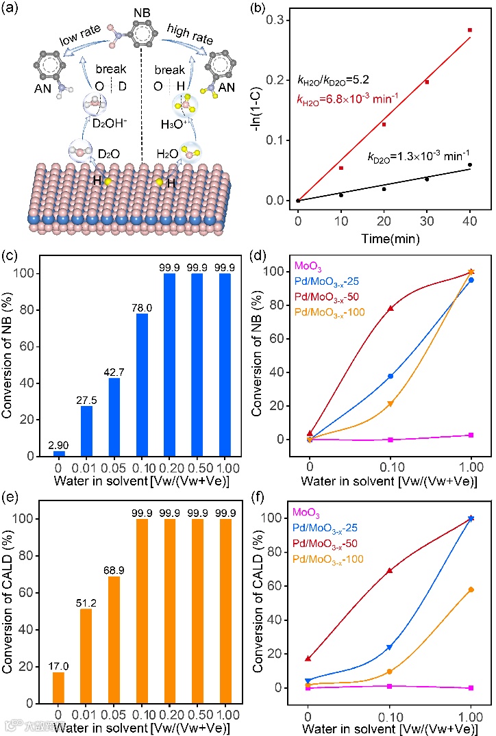 基于此,中南大学刘又年教授、郑州大学王立强副教授课题组报道了在催化加氢过程中金属氧化物载体的结构对WAPH的影响。具体地,构建了含氧空位的MoO3-x载体负载的Pd纳米颗粒催化剂(Pd/MoO3-x-R),其氧空位可以促进WAPH,从而有利于加氢反应。由于WAPH效应,水溶剂可以促进一系列底物的加氢反应,包括硝基苯、糠醛、喹啉和肉桂醛。而金属氧化物载体中的氧空位可以加强WAPH,从而提高加氢性能。