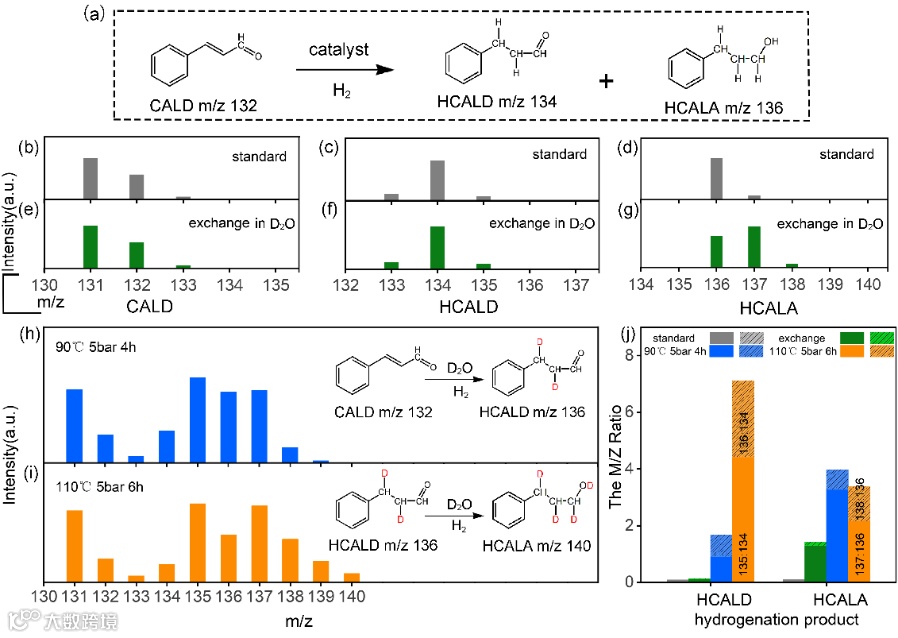 此外,当反应温度提高时110℃时间延长至6小时,氢化肉桂醇(HCALA)被确定为主要产物。HCALA在m/z=140、139和138处显示峰,HCALA的m/z=138和m/z=136的峰强度比增加,这些结果证明D2O在反应过程中不仅参与了C=C氢化,也参与了C=O氢化(图1)。