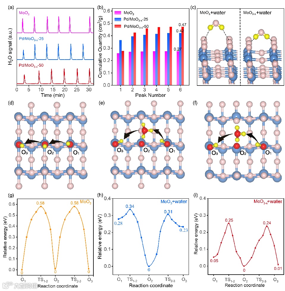 图3. (a-c)水的脉冲吸附图. (e-i) 水辅助质子跃迁的DFT计算