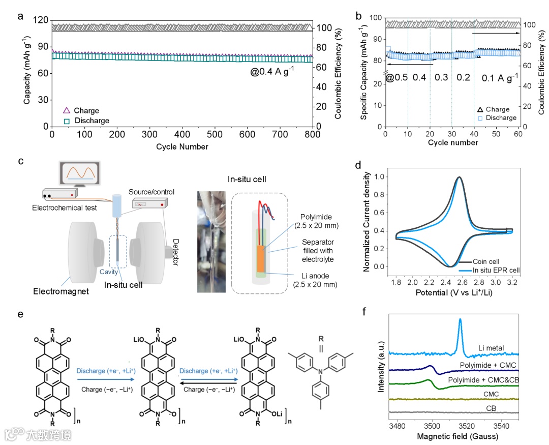 图1. 锂-聚酰亚胺电池的电化学性能。a)锂聚酰亚胺电池(CR2032)的循环稳定性和倍率性能。c)原位EPR测试装置示意图。d) 描速率为0.2 mV s-1的CV曲线。e)聚酰亚胺电极在LIBs中的储能机理示意图。f)电极和电池其他组分的EPR谱,包括锂金属、导电剂、粘结剂和聚酰亚胺。