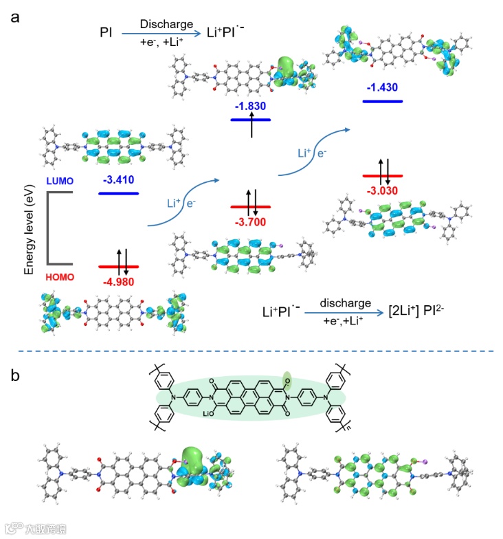 图4. DFT计算。a) 聚酰亚胺、阴离子自由基和二价阴离子的能级和前沿分子轨道图。b)阴离子自由基的分子结构、电子分布和自旋密度