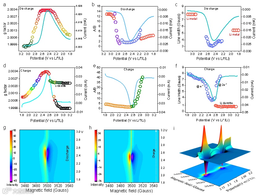 图3. EPR参数与原位电池工作电位关系图。电化学与EPR谱a - c) 放电过程中g值A/B和线宽的变化。d - f) 充电过程中g值A/B和线宽的变化。充放电过程中聚酰亚胺EPR信号等高线图,分别对应放电g)和充电h)过程。i)原位EPR谱的3D图。