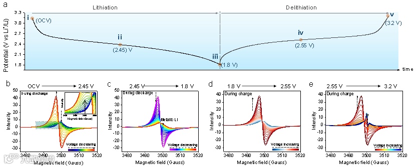 图2. 锂聚酰亚胺电池的原位EPR谱。a)原位电池的CV曲线。不同充放电阶段的EPR谱b) OCV-2.45 V、c) 2.45-1.8 V、d)1.8-2.55 V; e)2.55-3.2 V。