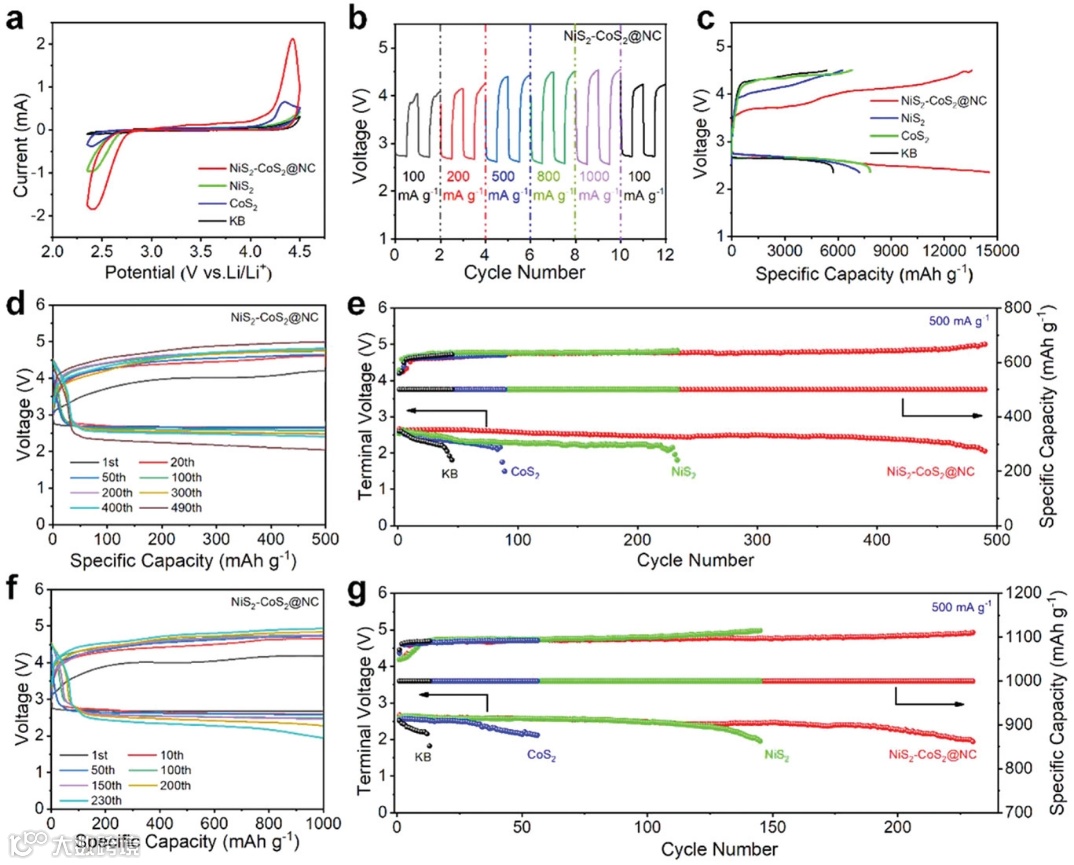 图3. 不同催化剂的a) CV曲线, b)倍率性能,c)初始放电/充电曲线,d-g) 不同电流下的放电/充电曲线与循环性能。