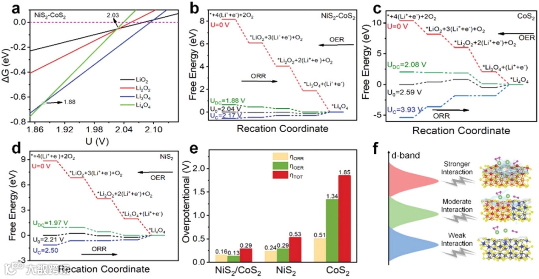 图5. a)反应相图;b) NiS2-CoS2, c) CoS2和d) NiS2的反应台阶图; e) ORR/OER过程的过电位; f)中间体与催化剂相互作用的示意图。