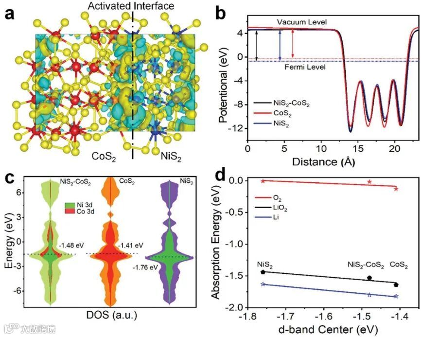 图1. a) NiS2-CoS2的差分电荷密度; 不同结构的b) 功函数 和 c) 态密度结果和虚线标记的d带中心; d) 计算出的不同结构的d-带中心与中间物质间吸附能图。