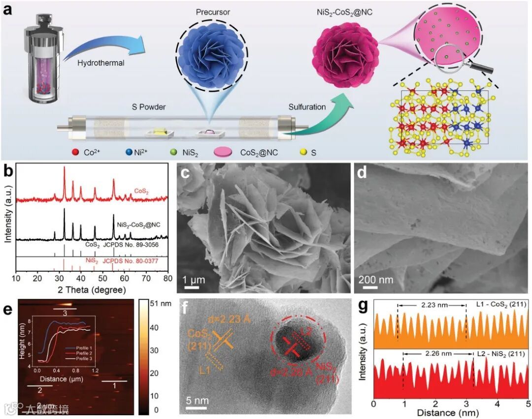 图2. a) NiS2-CoS2@NC的合成示意图; b)XRD谱图,c,d) SEM图,e)AFM图,f) HRTEM与对应的g)晶格测量曲线。