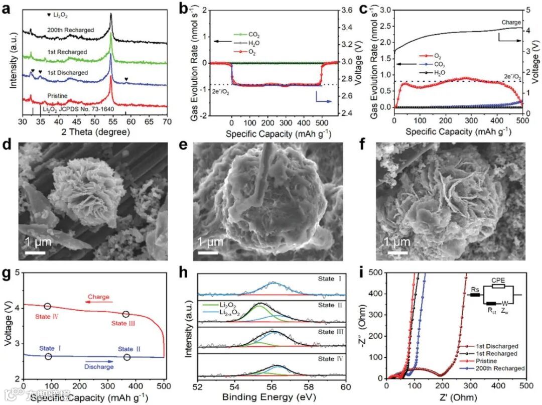 图4. a)不同阶段的XRD谱图; b)放电和c)充电下的DEMS结果; d-f)不同阶段的SEM图像; g-f)不同阶段对应的XPS谱; i)不同阶段的EIS图。
