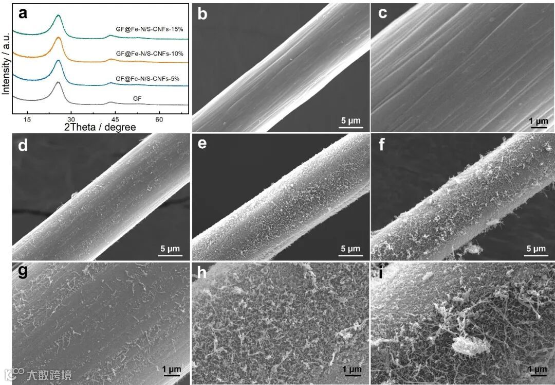 图2. GF和GF@Fe-N/S-CNFs系列样品的XRD、SEM图