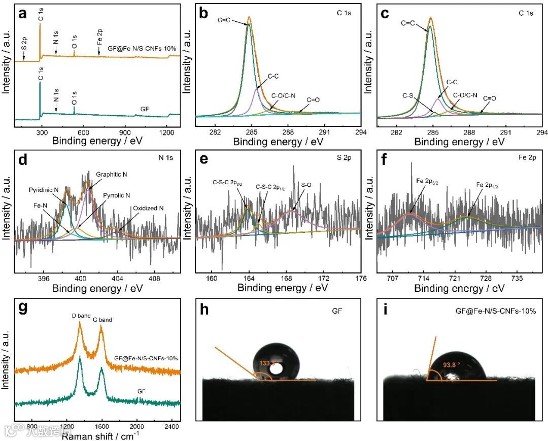图3. GF和GF@Fe-N/S-CNFs-10%的XPS、Raman、亲水性测试结果