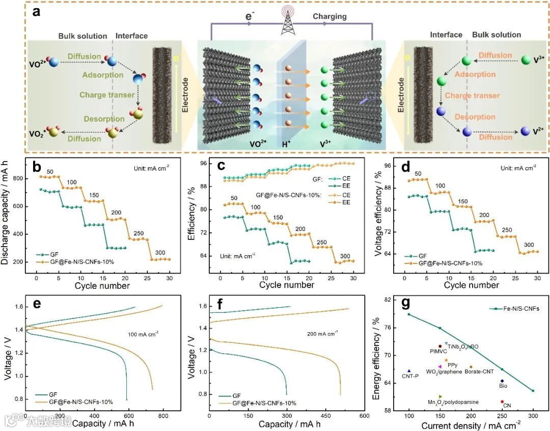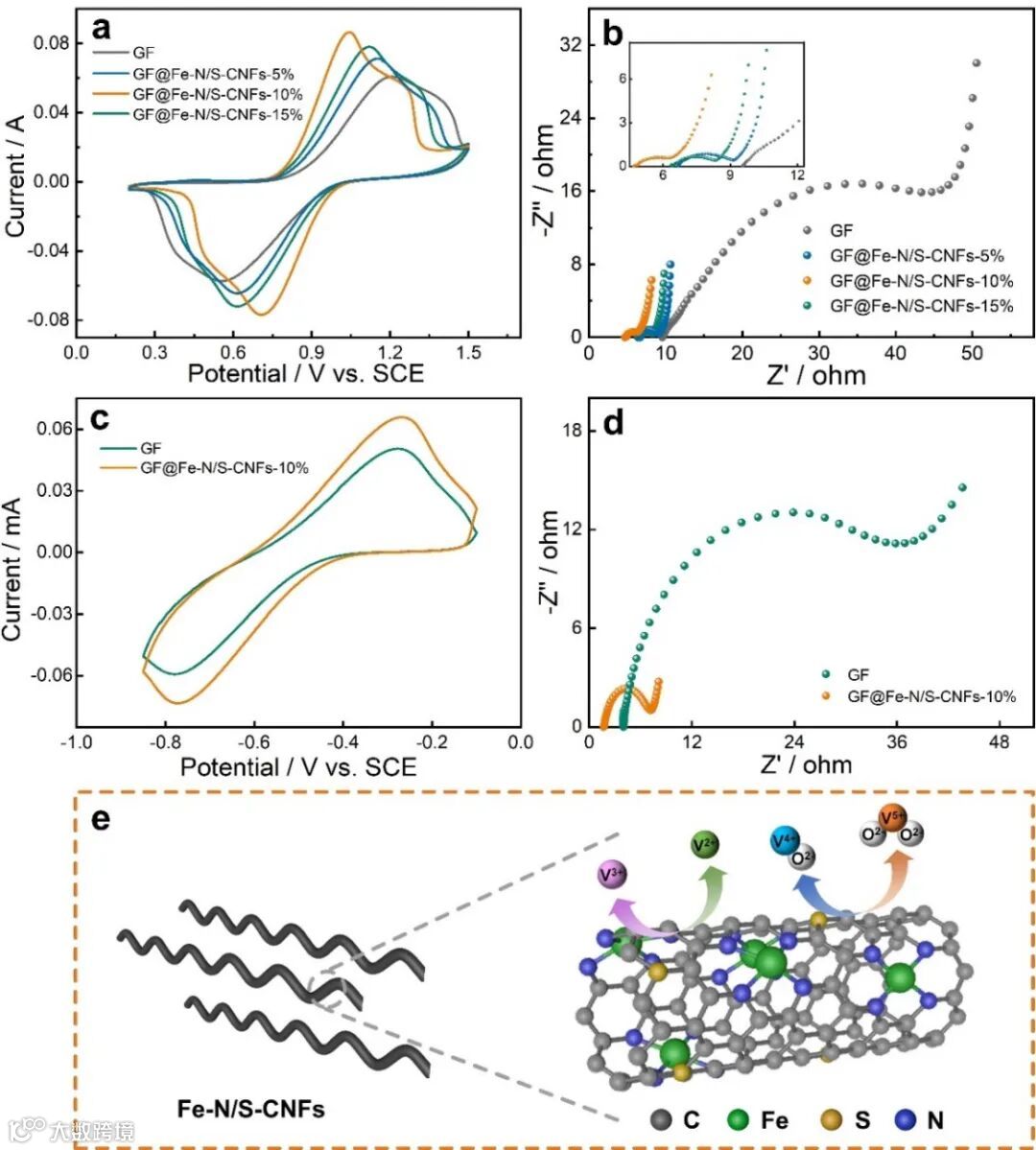 通过CV和EIS测试揭示了GF@Fe-N/S-CNFs系列电极对VO2+/VO2+和V2+/V3+氧化还原反应的催化作用。其中,GF@Fe-N/S-CNFs-10%电极上的氧化峰电流和还原峰电流最大,电荷转移电阻最小,展现出优异的电化学活性。GF@Fe-N/S-CNFs-10%电极表面碳纳米纤维负载量适中、活性位点丰富,其独特结构是其催化性能优异的重要原因。