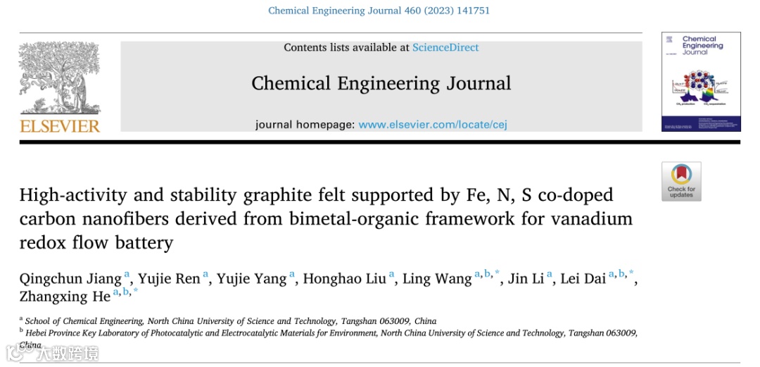 基于此,来自华北理工大学的王岭&戴磊&何章兴团队在国际知名期刊Chemical Engineering Journal上发表题为“High-activity and stability graphite felt supported by Fe, N, S co-doped carbon nanofibers derived from bimetal-organic framework for vanadium redox flow battery”的研究文章。
