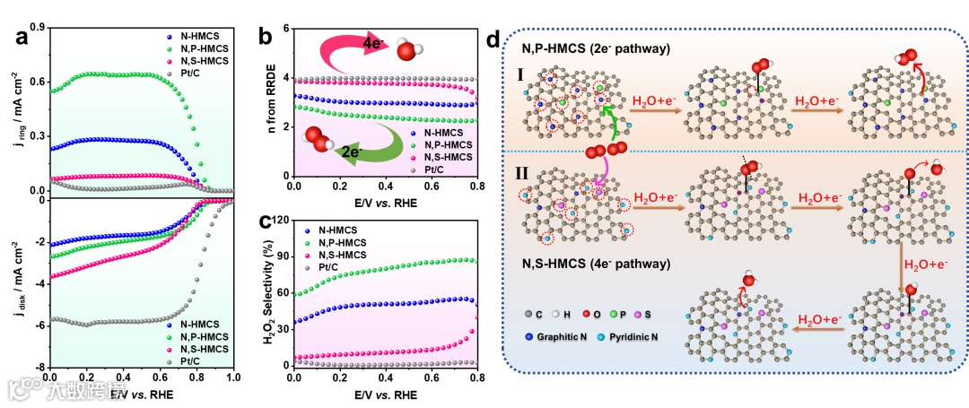 图2. (a)LSV曲线;(b)电子转移数;(c)H2O2选择性;(d)N,P-HMCS和N,S-HMCS的ORR路径机理。