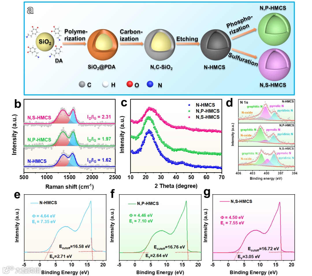 图1. (a)N,P-HMCS和N,S-HMCS催化剂的合成示意图;不同催化剂的(b)拉曼图,(c)XRD图,(d)XPS图和(e-g)UPS图。