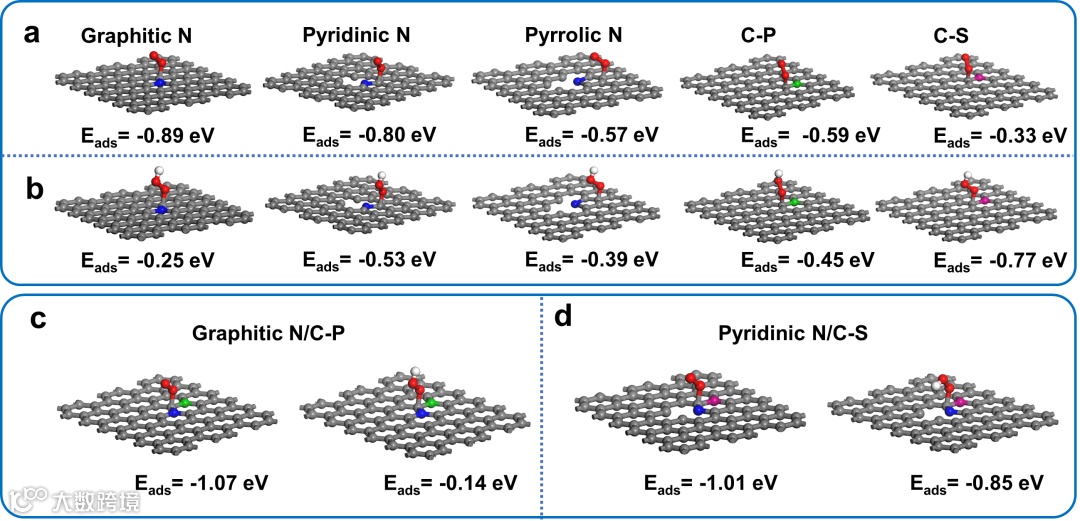 图3. 不同催化位点的优化构型及吸附能(a)O2分子和(b)*OOH中间体;(c)Graphitic N/C-P和(d)Pyridinic N/C-S位点的优化构型及其对O2分子和*OOH中间体的吸附能。