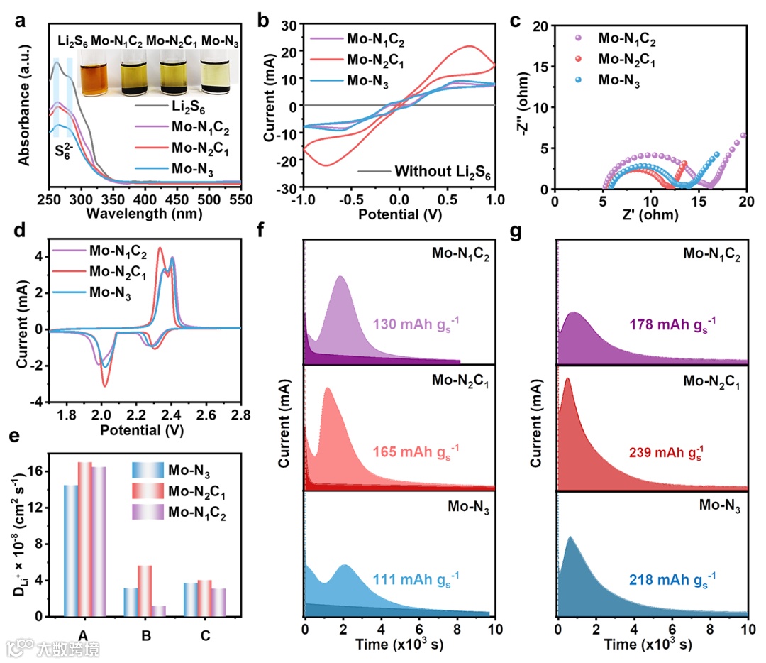 不同配体结构的钼单原子催化剂对多硫化物的吸附性能不同,随着Mo-N配位数的增加对多硫化物的吸附能增强,这与以上的理论计算结果一致。进一步通过电化学测试证明了Mo-N2C1可以有效的促进多硫化物的催化转化、锂离子的扩散以及硫化锂的成核和分解能力,这是源于Mo-N2C1与多硫化物适当的相互作用。基于以上的分析验证钼单原子的配体结构可以有效的调控多硫化物的吸附转换,从而促进多硫化物双向的催化转化,获得了优异的电化学性能。