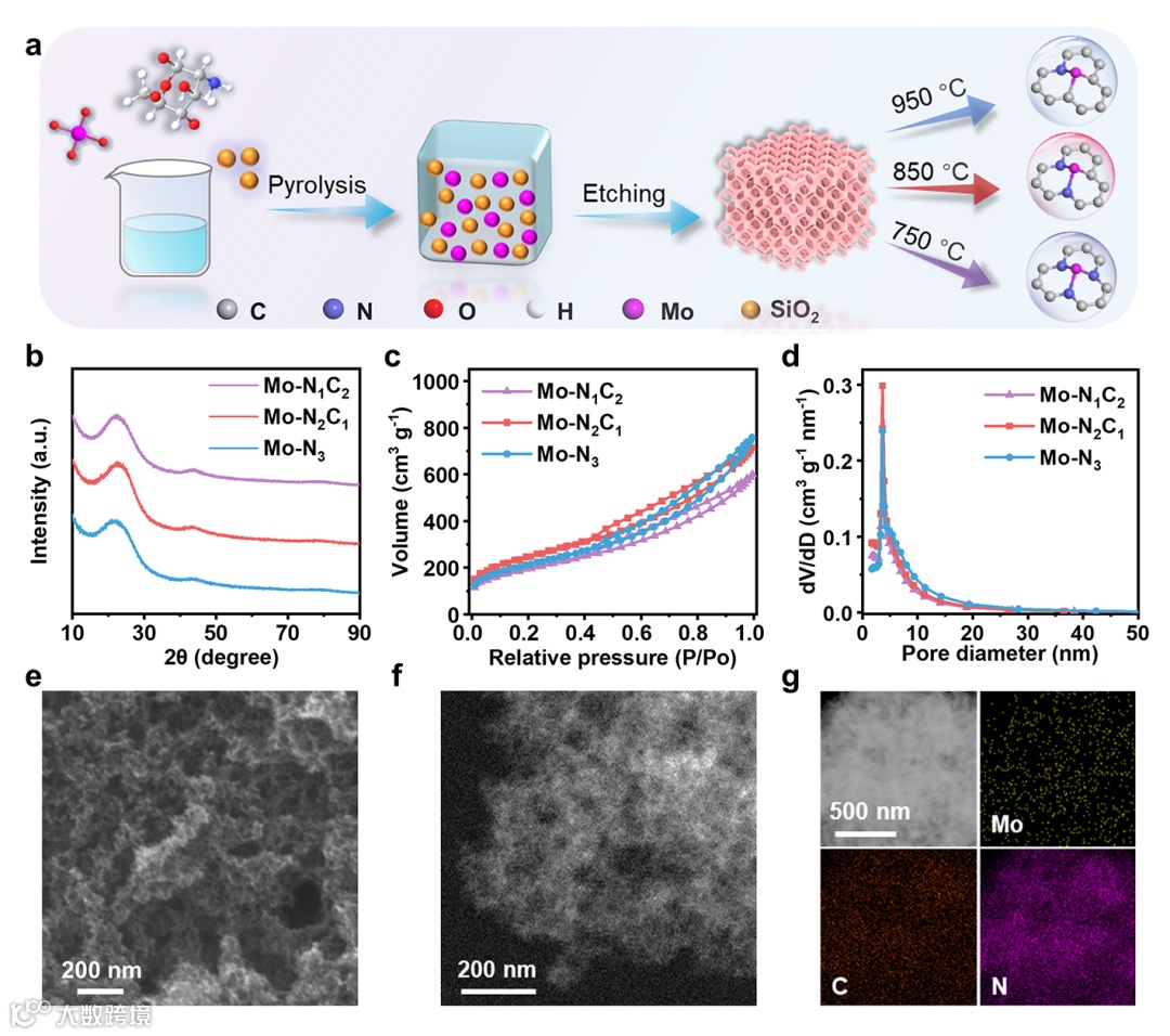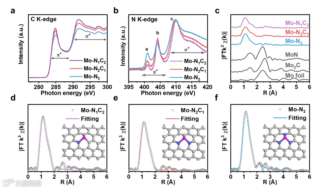 通过调控热解温度以获得不同配体结构的钼单原子催化剂,如下图2所示。为了进一步研究不同配体的催化剂的物理性质,借助SEM,XRD,TEM对物相和相貌结构进行表征,证明制备的不同配体催化剂在比表面积、形貌结构和结晶度方面具有相似的物理性质,说明催化剂电化学性能的差异主要是由于配体结构的差异。为了证明制备单原子催化剂的配体结构,利用X射线吸收谱进行表征。结合碳和氮的吸收边揭示了随着热解温度的升高,Mo-N配位逐渐降低,证明了热解温度对配位结构的调控策略。结合扩展边的定量的拟合,揭示了催化剂单分散的性质以及配位结构的变化,如下图3所示。