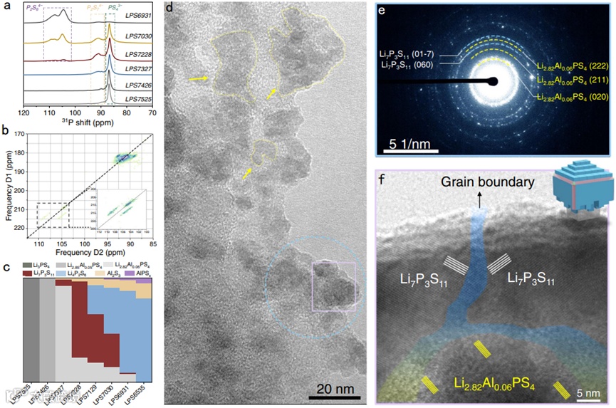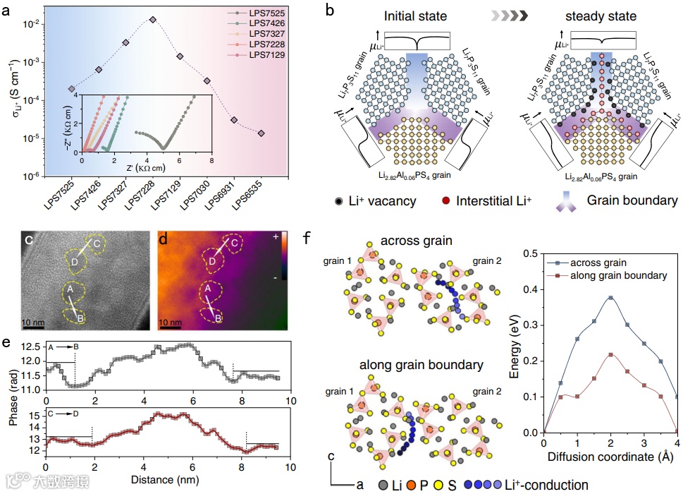 对含有丰富纳米畴结构的LPS7228电解质进行电导率测试,发现其室温离子电导率可以达到13.2 mS cm-1。作者将其电导率的升高归因为锂离子沿晶界方向的快速离子输运行为。首先纳米晶界的形成会使载流子在晶界上发生再分布(图3b),使得沿晶界方向载流子浓度升高,这一现象随后被电子全息术所验证(图3c)。其次,图3f所示的DFT计算验证了锂离子沿晶界传输具有更低的传输势垒。由于畴内遍布大量的晶界,锂离子可在沿晶界方向上快速输运,从而极大提高了材料的室温离子电导率。