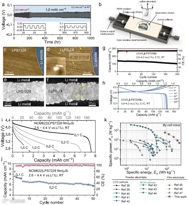 对比常见的Li6PS5Cl电解质,LPS7228具有非常好的锂负极兼容性。通过将LPS7228与PTFE粘合剂混合,制备出厚度为110μm的自支撑硫化物薄膜,其室温电导率可达为10.3 mS cm−1。利用面容量为8mAh cm-2,厚度220um的厚NCM622电极,组装了NCM622|LPS7228 film|Si全固态电池,该电池的能量密度可以达到420 Wh/kg。在0.1 C的充放电倍率下,获得了171 mAh g−1 的初始放电容量,对应面容量为7.62 mAh cm−2。当把倍率增加到0.2 C时,该电池依然稳定循环了50次,平均库伦效率为98.1%。