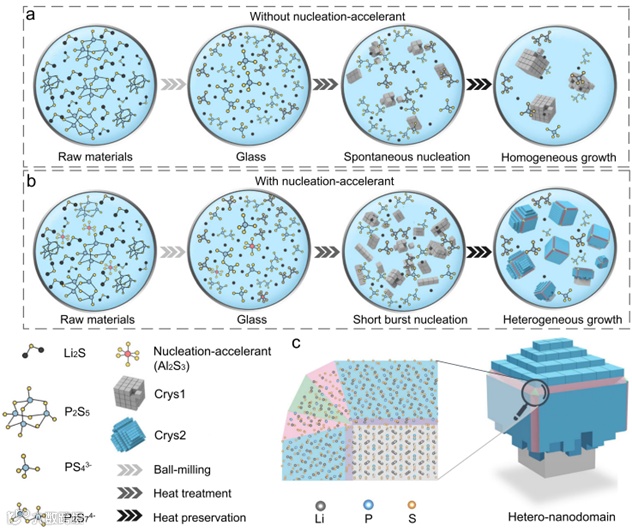 图1. 次序化结晶与异质生长模型。(a)无成核助剂调节下的玻璃陶瓷电解质生成过程。(b)无成核助剂调节下的玻璃陶瓷电解质生成过程。(c)纳米异质畴结构示意图