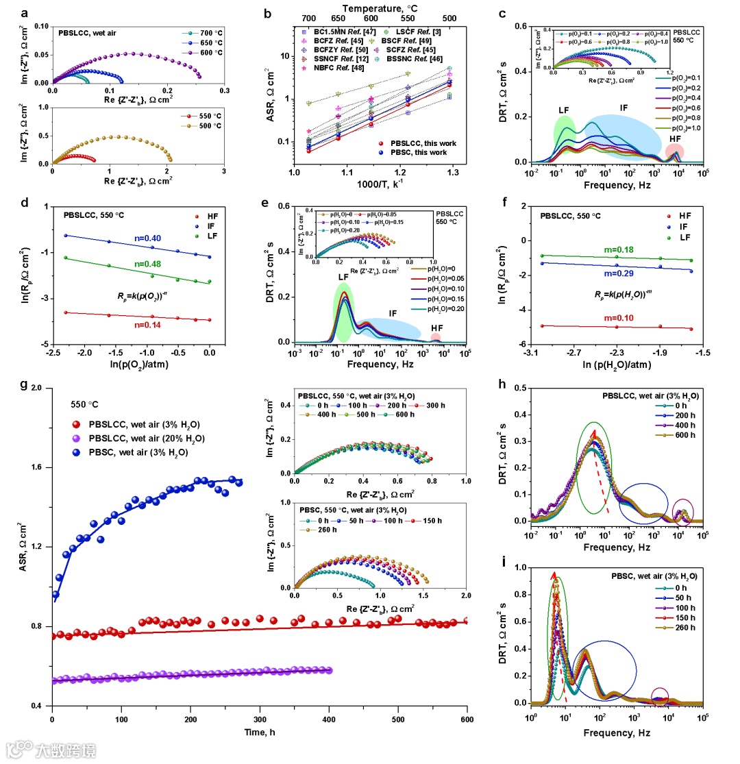 (a) 基于BZCYYb的具有HE-PBSLCC电极的对称电池的电化学阻抗谱(EIS);(b) HE-PBSLCC和其他报道的优秀电极的极化电阻(Rp)的温度依赖性;(c) HE-PBSLCC电极的弛豫时间(DRT)随pO2变化的分布(在550 °C下测量);插图是HE-PBSLCC电极的相应EIS;(d) 作为pO2函数的IF、LF和HF范围内每个Rp的依赖性;(e) 在550 °C下测量的HE-PBSLCC电极的DRT与pH2O的关系;插图是HE-PBSLCC电极的相应EIS;(f) IF、LF和HF范围内每个Rp的依赖性是pH2O的函数。(g) 在550 °C OCV条件下,湿空气(3%和20% H2O)中HE-PBSLCC和LE-PBSC电极Rp的时间依赖性;插图为HE-PBSLCC和LE-PBSC在湿空气(3% H2O)中的EIS;(h) HE-PBSLCC的DRT和(i)在湿空气(3% H2O)中不同测试时间的LE-PBSC电极。