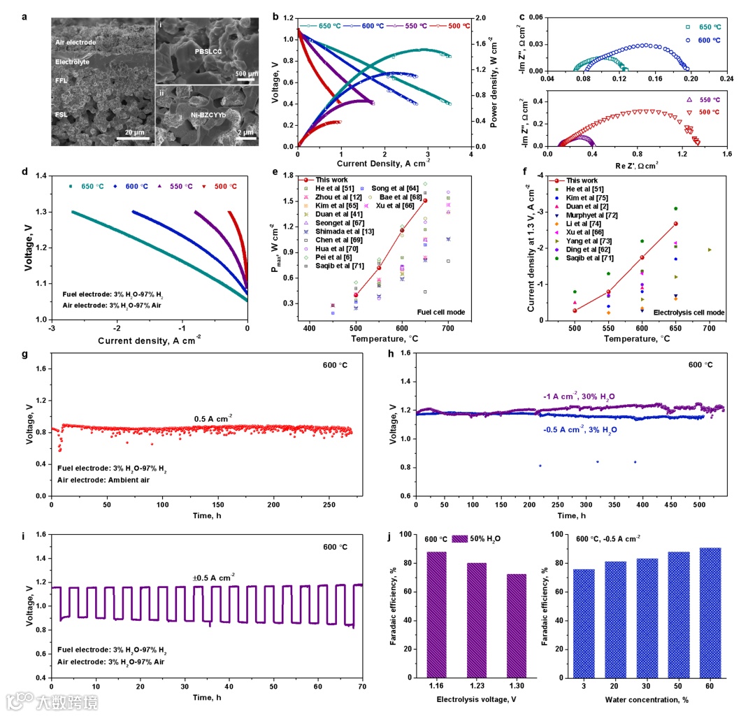 (a) 由多孔空气电极(i)、多孔镍BZCYYb燃料电极(ii)和致密BZCYYb电解质组成的镍BZCYYb电极支撑的单电池的典型截面SEM图像;具有HE-PBSLCC空气电极的单电池的典型I-V-P曲线(b)和EIS(c),在500-650 °C湿氢(3% H2O)中测量;(d) 当燃料电极以H2(3% H2O)为燃料且空气电极暴露于湿空气(3% H2O)时,在500-650 °C的EC模式下电池的典型I-V曲线;报告的代表性空气电极和HE-PBSLCC(本工作)的峰值功率密度(e)和电流密度(f)的比较;在600 °C和恒定电流密度0.5 A cm-2(FC模式)(g)以及恒定电流密度-0.5 A cm-2和-1.0 A cm-1(EC模式)(h)下对单电池进行稳定性试验;(i) 当在FC和EC模式之间以2小时的间隔切换操作模式时,R-PCEC在600 °C下以±0.5 A cm-2的电流密度进行可逆循环操作;和(j)在600 °C时,不同电解电压(左侧)和3%、20%、30%、50%和60%(右侧)的不同H2O浓度下,R-PCEC制氢的法拉第效率。