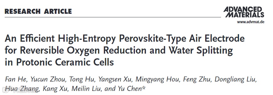 可逆质子陶瓷电化学电池(R-PCEC)正在成为在中低温(400-700 °C)下进行高效能量转换(发电)和储存(产生H2)的理想设备。然而,它们的商业化在很大程度上受到开发用于氧还原和水分解反应的高效空气电极的阻碍。基于此,华南理工大学陈宇教授团队在国际知名期刊Advanced Materials上发表了题为“An Efficient High-Entropy Perovskite-Type Air Electrode for Reversible Oxygen Reduction and Water Splitting in Protonic Ceramic Cells”的文章。文章第一作者为何帆和周玉存。