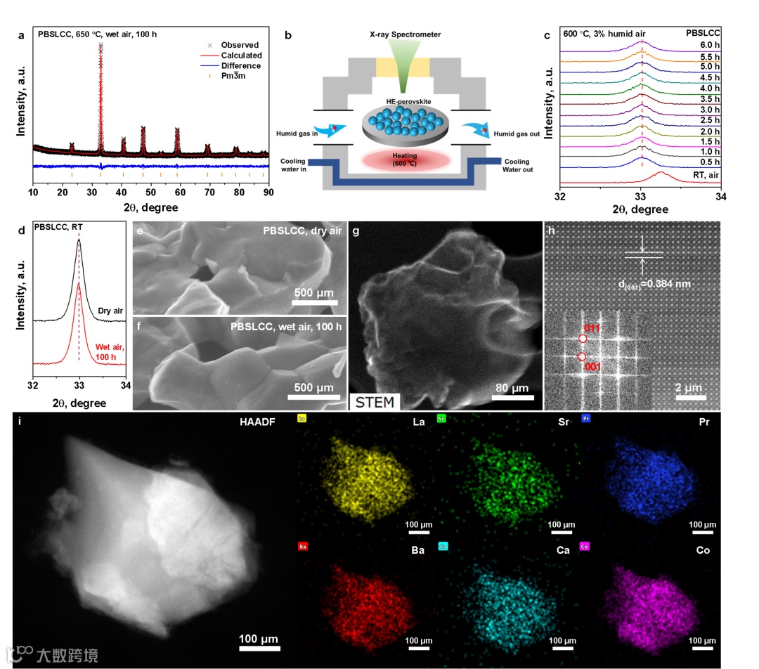 (a) HE-PBSLCC粉末在650 °C湿空气(3% H2O)中处理100小时后的XRD Rietveld精修;(b) 用于原位XRD测量的实验设置示意图;(c) HE-PBSLCC粉末在600 °C下暴露于湿空气(3% H2O)不同处理时间后的XRD图谱;(d) 暴露于干空气和湿空气(100小时,3% H2O)后HE-PBSLCC的XRD图谱。HE-PBSLCC粉末在650 °C下暴露于湿空气(3% H2O)100小时之前(e)和之后(f)的SEM图像;HE-PBSLCC颗粒的STEM(g)和高分辨率TEM(h)图像。插图是(h)中的快速傅里叶变换(FFT)模式;和(i)高角度环形暗场STEM图像,以及HE-PBSLCC颗粒中Pr、Ba、Sr、La、Ca和Co的X射线EDS图谱。