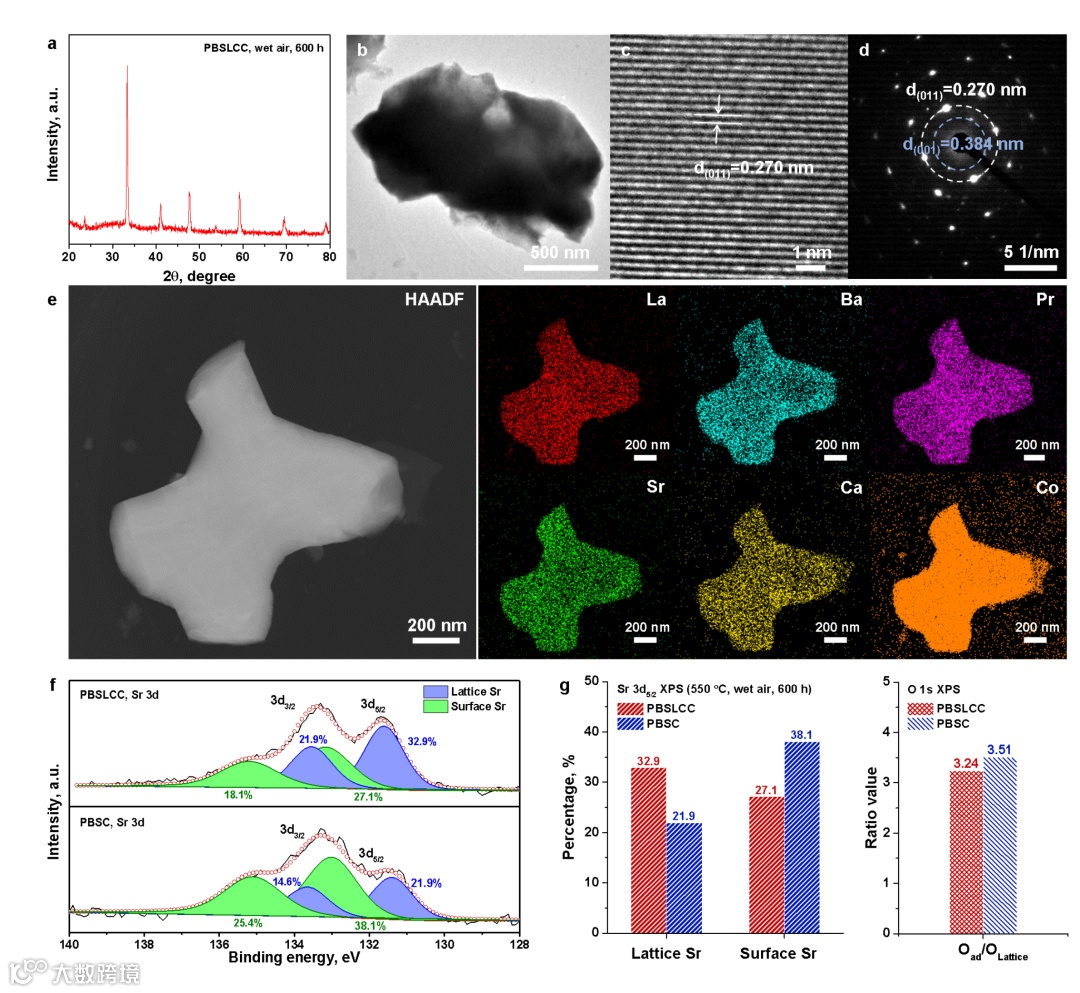 (a) HE-PBSLCC在550 °C湿空气中处理600小时后的XRD图谱;(b) STEM图像、(c)HR-TEM图像、(d)SAED图像和(e)HE-PBSLCC在550 °C湿空气中处理600小时后的STEM-EDS图;(f) HE-PBSLCC和LE-PBSC在550 °C的湿空气中处理600小时后的Sr 3d XPS曲线;(g) HE-PBSLCC和LE-PBSC样品在550 °C的湿空气中进行相同处理600小时后,晶格Sr和表面Sr含量的面积百分比比较(右),从(f)中的Sr 3d5/2 XPS获得;以及来自O1s XPS结果的相应Oad/Olattice比值(左)。