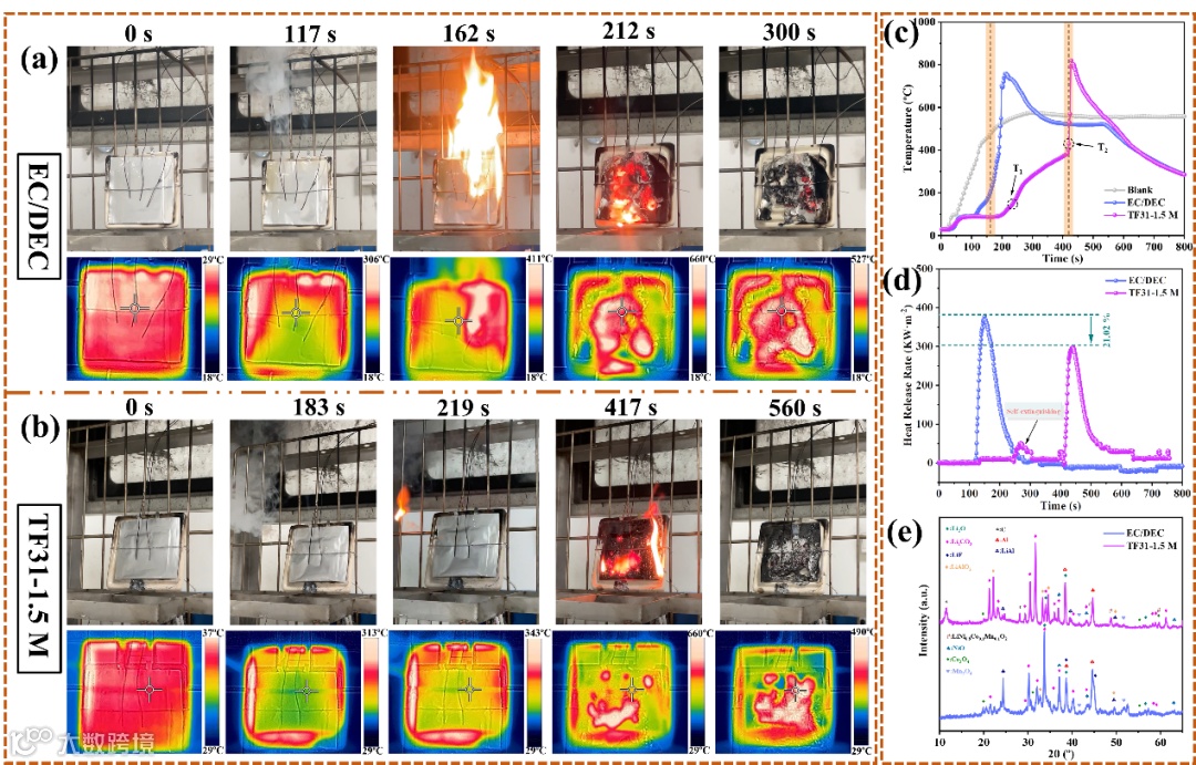 重要的是,在组装成锂金属软包全电池后,该电解液在持续外部高温加热条件下能将锂金属软包电池的点燃时间推迟了255秒,燃烧热量释放峰值降低21.02%,大幅提升了锂金属电池的火灾安全性。这种新型电解液可以为开发高电化学性能和高安全性的锂金属电池提高重要参考价值合指导意义。