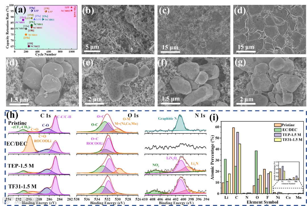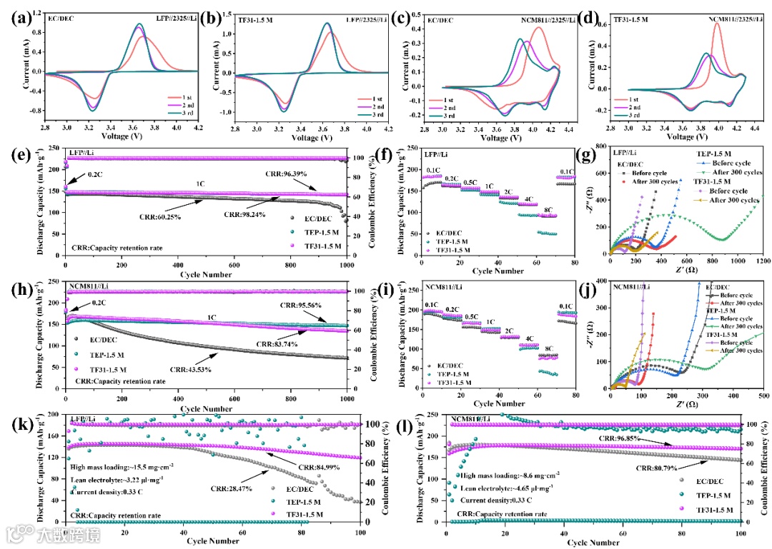 与商业碳酸盐电解质相比,这种不易燃的电解质表现出相当的离子传导性和更宽的电化学窗口。应用至LFP/Li和NCM811/Li电池体系中,TF31-1.5M电解液通过形成更稳定的CEI保护层和高压稳定性,展示出优异的循环稳定性,经历1000次循环后的容量保持率分别高达96.39%和83.74%,远高于使用商业电解液的电池(1000次循环后分别为60.25%和43.53%)。在高活性物质载量和贫电解液状态下同样显示更为优异的循环结果。