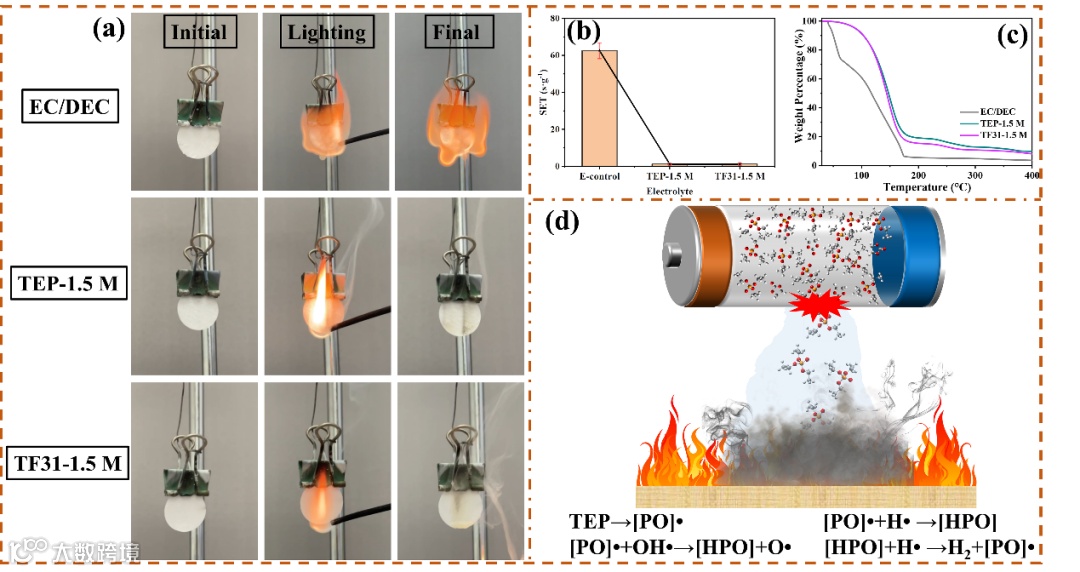 此外,锂枝晶的无限制生长会刺穿隔膜,从而引发内部短路,进而导致电池热失控,甚至爆炸等一系列安全事故。同时,电解液通常由传统低沸点、热稳定性差、易燃性的碳酸酯类或醚类溶剂组成,当电池被置于热滥用、机械滥用或电滥用的条件下时,易燃的电解液会加剧电池的燃烧与火焰的蔓延。因此,电解液的可燃性也是严重影响锂电池的安全性能的关键因素。