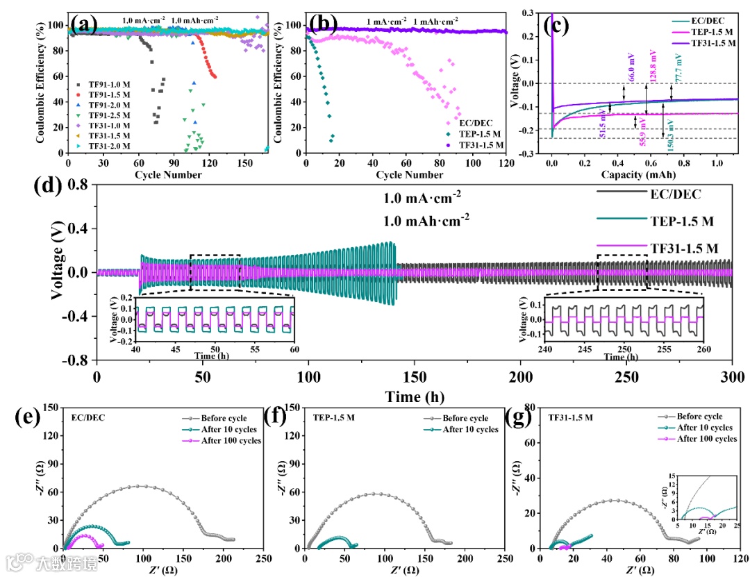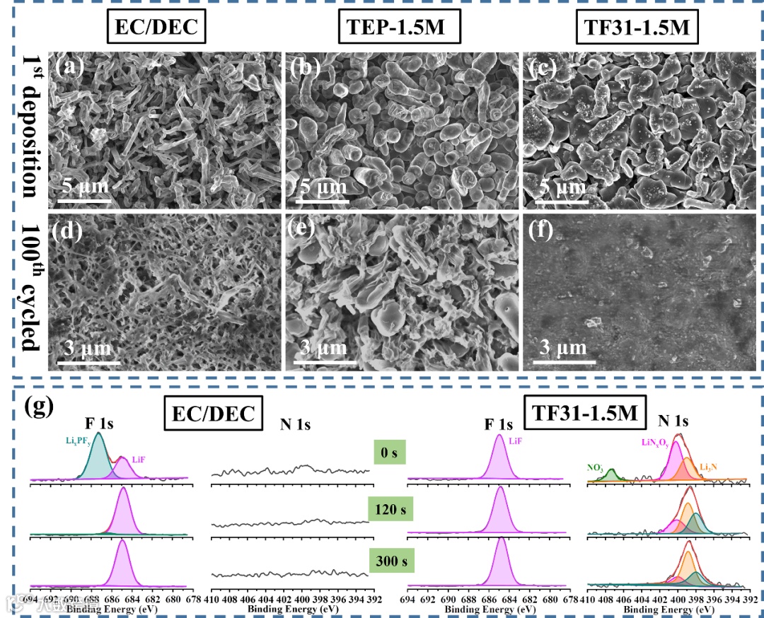通过对溶剂成分、比例以及锂盐浓度的操控,优化出能形成富含高离子传导性Li3N和LiF成分的超稳定有机-无机杂化SEI膜的电解液配方。在Li-Cu测试中,在1.0 mA cm-2的电流密度下,TF31-1.5M电解液能以高达98.31%的库伦效率稳定运行超160圈。在Li-Li测试中,使用TF31-1.5M电解液的电池能以最低的极化电势稳定工作超300小时。对沉积的金属锂形貌进行分析发现,使用不燃电解液的金属锂呈大块状沉积,无锂枝晶产生。