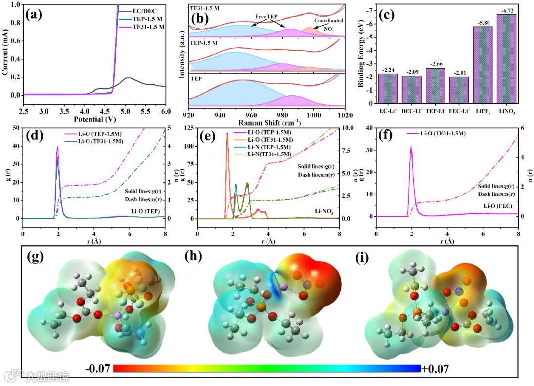 图3. 各电解液的LSV、拉曼光谱测试;电解液各组分的溶剂化能计算和MD模拟结果。