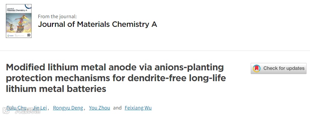 基于此,来自中南大学的吴飞翔教授课题组,在国际知名期刊Journal of Materials Chemistry A上发表题为“Modified lithium metal anode via anions-planting protection mechanisms for dendrite-free long-life lithium metal batteries”的研究论文。该文章通过在锂金属负极上预埋各种盐阴离子的策略,构建了具有多种无机组分的人工SEI层。