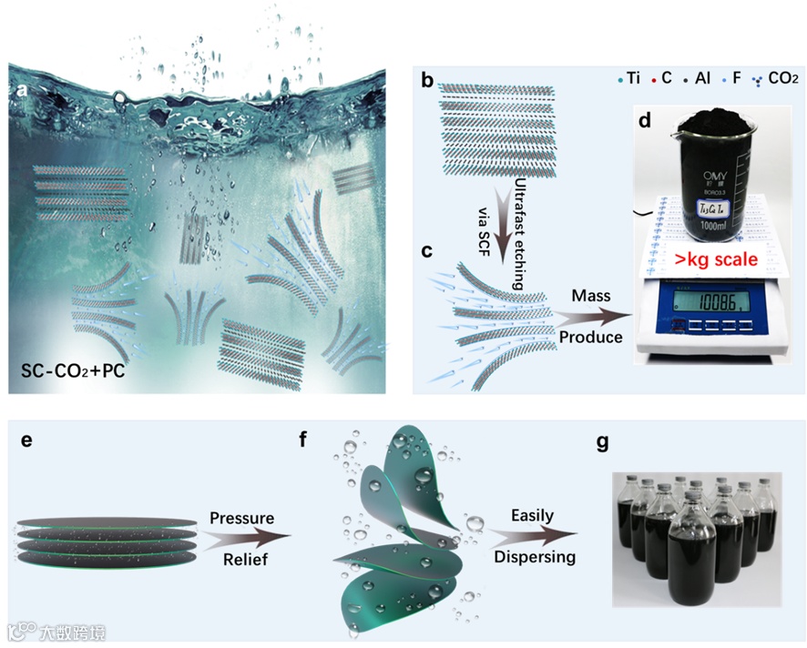图1. 超临界二氧化碳辅助下Ti3C2Tx MXene的超快蚀刻工艺和Ti3C2Tx MXene稳定分散液的制备原理图。